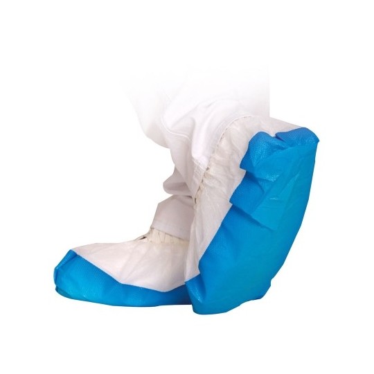 Ce couvre-chaussure se compose d’une partie supérieure en polypropylène blanc et d’une semelle en polyéthylène chloré bleu. La partie blanche est perméable à l'air et respirante, ce qui augmente considérablement le confort. La semelle en CPE est extrêmement robuste et résistante à la déchirure. De plus, la semelle extérieure est particulièrement antidérapante et offre une protection optimale contre les liquides car elle est imperméable.